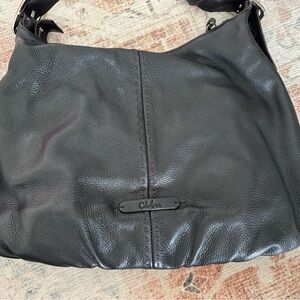 Elegant black leather shoulder bag with stylish buckle accents. Perfect for any occasion.