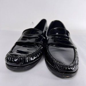 Cole Haan Black Patent Leather Slip On Low Block Heel Moc Toe Penny Loafer