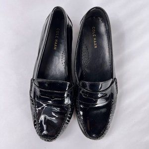 Cole Haan Black Patent Leather Slip On Low Block Heel Moc Toe Penny Loafer 6.5