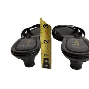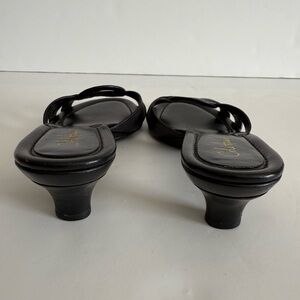 These stylish black sandals by Cole Haan feature a chic crisscross strap design adorned with gold-colored studs. Made from a smooth material, they offer a comfortable fit with a flat sole, perfect for casual outings. 2” Kitten Heel. Black leather. Sole has leather rim around toe bed. See photos. Missing one center stud on right shoe. See photos. Perfect for casual or dressing up. Ronda Slide. Color: Black with gold studs. Style: D23998. Size 5. Pet free smoke free environment Cole Haan D23998 Size 5 Black Kitten Heel Black slide Ronda Slide