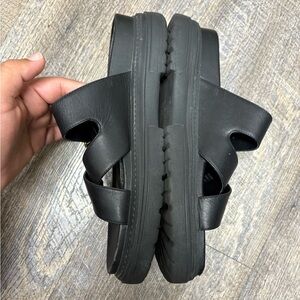 Stylish black slide sandals featuring a gold buckle. Perfect for casual wear.
