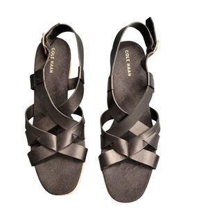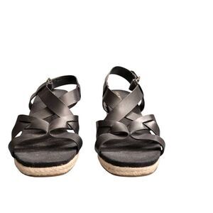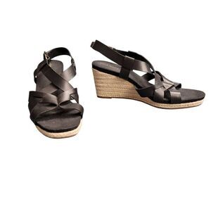 Chic black sandals with a stylish wedge. Strappy design for a modern look. Ideal for versatile wear.