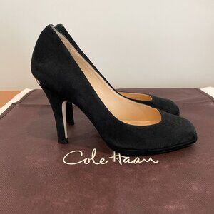 Like new (worn just a few times), black suede square toe platform pumps, by Cole Haan with dust bah included for travel. These shoes jave a black patent leather band at the top of the heel - a nice accent detail. They have a padded leather insole for comfort and a leather sole. The heel is 4 1/4 inch eith a 3/4 inch platform. They are free of defects.