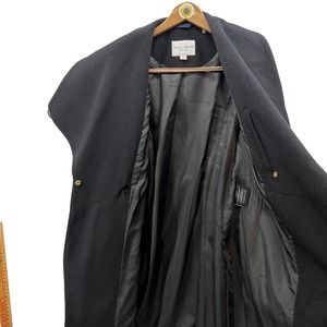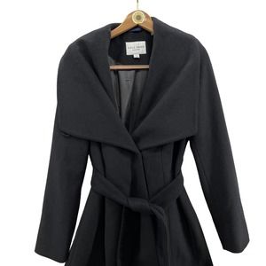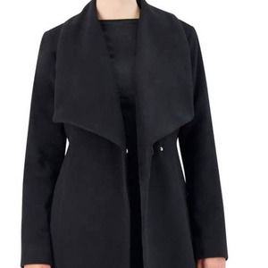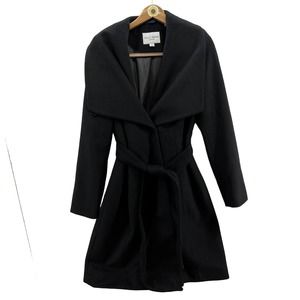 Elegant black wrap coat. Features a tie belt. Long sleeves. Perfect for any occasion.