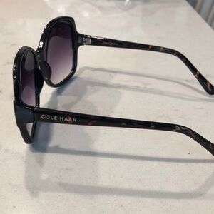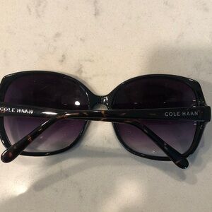 Chic sunglasses with a sleek black frame and tortoise ear bars. Features stylish purple-tinted lenses.