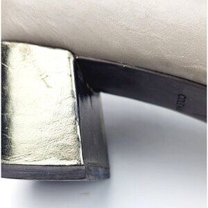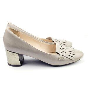 Classic leather pump with a flare block heel. Refined square toe and leather fringes. Gold metallic heel.