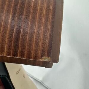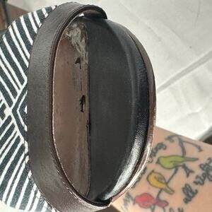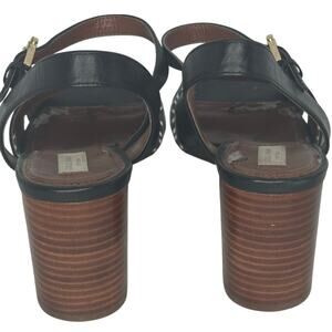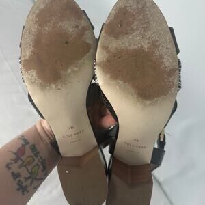Cole Haan leather sandals. Heel height is 3"; no platform. Areas on both insoles have pieces of the material peeling. Only on unseen areas. Small chip in one corner of one heel. Please see pics before purchase.