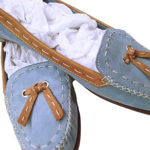 Cole Haan Blue Suede Shoe Flats -9.5B Bow Tassel Leather Stitch Moc-Toe Slip-On