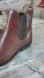 New with tag.. boots at only being tried on. Beautiful rustic leather. Scratches and minimal creasing but that only adds to the beauty of the boots and it is the character of the leather. Slip-on Style with elastic on both sides of the ankle