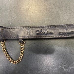 Cole Haan navy leather bracelet. Gold-tone buckle and chain detail. Length: 10".