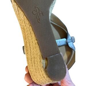 Step out in style with these brand new Cole Haan silver leather sandals! Perfect for adding a touch of elegance to any outfit. These sandals are not only fashionable but also offer the comfort and quality you expect from Cole Haan. small chip in rubber heel not noticable and doesnt effect walking