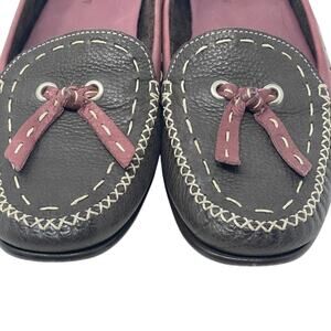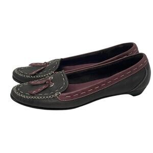 Cole Haan Brown & Mauve Leather Flats. Size 8.5B. Leather with cross-stitching & top stitching & decorative tassel tie at vamp. Soft suede lining & leather footbed. Quality workmanship in excellent preowned condition.