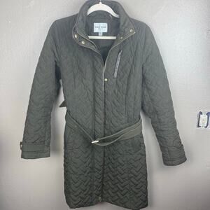 Cole Haan Brown Quilted Belted Coat Med Long Jacket Hooded
