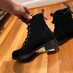 Versatile waterproof and stylish combat boots. Some wear down on the rubber of heels, light scuffing on suede as shown in photos.