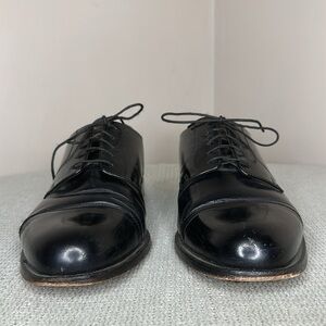 A great pair of men’s shoes by Cole Haan in men’s size 11 1/2. Black in color, the style is a cap toe Oxford. This is a vintage pair and has been well loved and worn, despite that fact they e got some life left in them and a good buff could perhaps get some of the scuffs out.