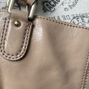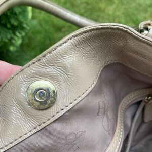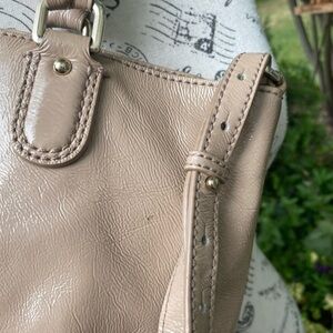 Pre loved bag from Cole Haan. Color is champagne, slightly pink. It has shine to it without being too much. It is a soft leather. Not a structured kind of bag. Lots of storage in and out. Snap magnet closure.
