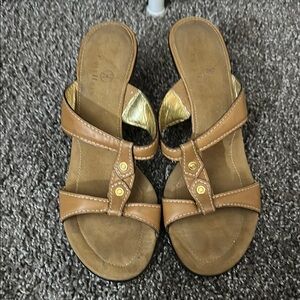 Elegant brown sandals featuring gold accents. Perfect for versatile wear. size 8