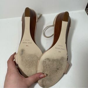 Gently worn women’s size 9.5 Cole haan cream colored heeled sandals. Please review all photos for any signs of wear-pictured as is. Disclaimer: Any items with any wear/staining has not been treated, and unsure of ability to remove/treat condition. Comes from a smoke free home, bundle with other items to save & minimize shipping cost.