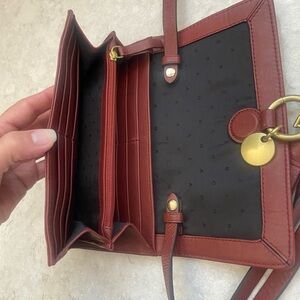 Elegant Burgundy/Chestnut Brown leather crossbody with sleek design. Features removable leather strap so it may be carried as a clutch. Leather strap shoulder drop is approximately 22" to 26" at shortest to longest length.