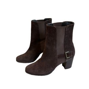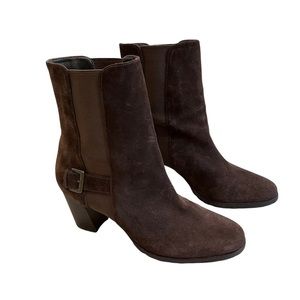 Cole Haan D25458 Callan Chocolate Brown Suede Mid Calf Pull On Boots Booties With Stacked Heels and Buckle detailing on the side. Elastic goring on both sides for easy pull on. Genuine Leather upper. Leather and rubber sole. Classic style. Almond toe. Exceptional quality and very comfortable.