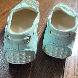 The shoes is Gorgeous aqua blue color, these classic Cole Haan driving moccasins. Genuine hand sewn moccasin with contrast around-the-collar boat lacing. Slip-on construction. Flexible rubber pod outsole