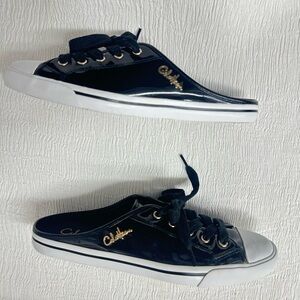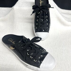 Chic Cole Haan slip-on sneakers with glossy black finish. Features lace-up front and white toe cap. Ideal for everyday wear.