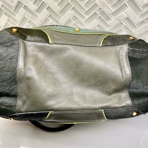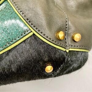 Cole Haan Large Exquisite Gold Fish Handbag features reptile print, calf hair, leather patchwork. Gorgeous tones of green and gold tone hardware. Side pockets for easy access, along with additional interior pockets.
