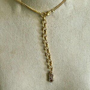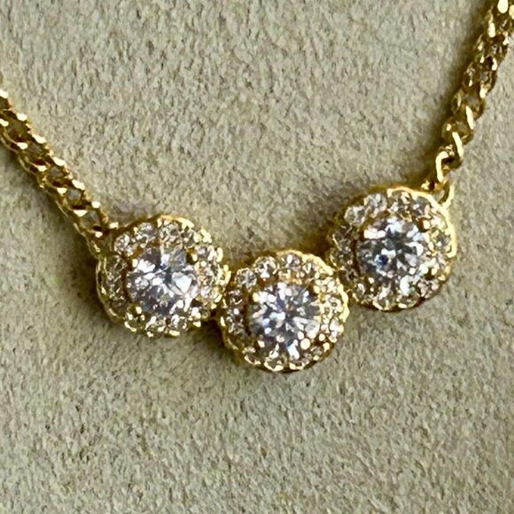 This is a shiny gold-tone necklace with three sparkling clear stones from Cole Haan. The photos do not do this one justice. The length is adjustable from 14 to 18 inches.