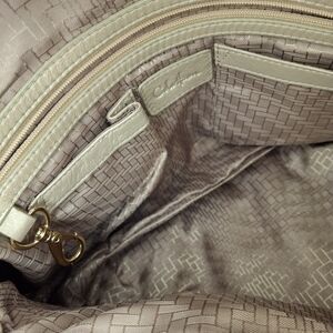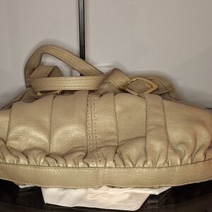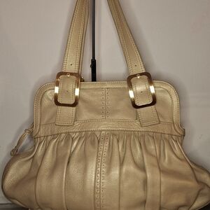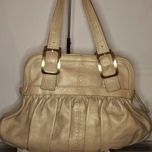 Chic cream leather shoulder bag with gold buckle accents. Perfect for everyday use.