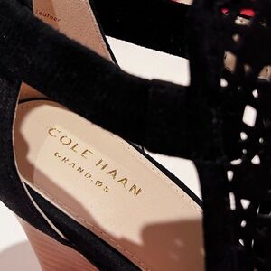 NWOT - These stylish black 3 1/4 inch wedge sandals from Cole Haan feature an open toe design and an intricate cutout pattern that creates a light and airy look. Made from a soft suede leather material, they offer a comfortable fit with a wide ankle opening for easy wear.
