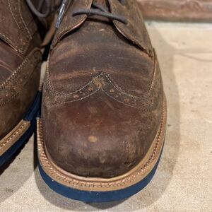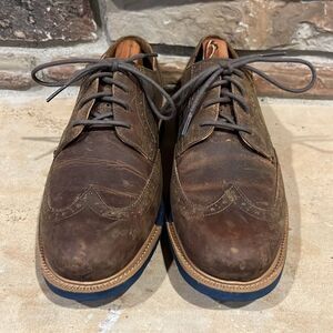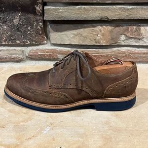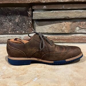 Cole Haan Grand OS brown rugged leather wingtip oxford shoe. Waxed, not shiny polished, leather upper. Blue rubber sole. Gently used preowned condition, see photos. Most items ship next business day.