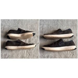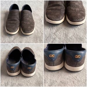 Good-to-fair used condition. Crosscourt Paisley Perforated Slip-On Sneakers by Cole Haan in dark blue with gray and white detailing. Classic preppy aesthetic, an elevated take on the classic sneaker silhouette. Slip-on skater shoes with leather upper, lightweight EVA outsole and Grand OS comfort footbed for all-day comfort. Stretchy elastic goring on either side for easy on/off. Perforated paisley design at upper, see video. Note: moderate wear throughout, including fading/discoloration to uppers, creasing to leather uppers, streetwear and discoloration to bottom sole and outsoles, & fading/discoloration to insoles, see photos. Size 6.5, see photos for measurements.