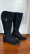 Cole Haan Indiana black waterproof suede knee high riding boots size 9 style D42391. Feature a black waterproof suede leather upper, interior zipper, two adjustable side buckles with silver hardware, rubber sole and stacked block heel. shaft height approximately 14.5", heel 1.25". Very good used condition, some minor wear throughout Chic and versatile over the knee boots. Features sleek black design with buckle accents.