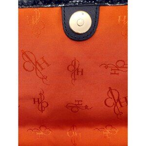This Cole Haan Izzie clutch features a gorgeous woven leather design in an elegant Prussian blue with contrasting orange interior lining. Perfectly crafted with a magnetic snap closure for secure storage.