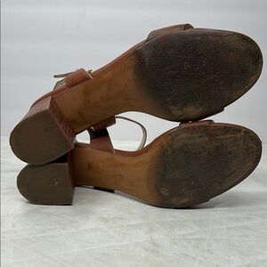 These Cole Haan brown heels feature a sleek, minimalist design with a simple ankle strap and a low heel, perfect for versatile styling. The rich brown leather and open toe add a touch of elegance to any outfit, making them ideal for both casual and formal occasions.