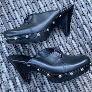 Black leather clogs with O ring on vamp. stitching throughout. Pewter studs. Elastic gussets on inner sides for added comfort. Stacked heel featuring a stitched underside for the leather covered platform.