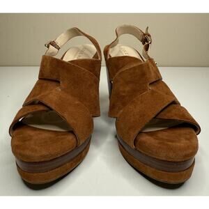 Cole Haan Laci Platform Wedge Sandal Women 7B Cognac Suede Buckle Strap Peep Toe