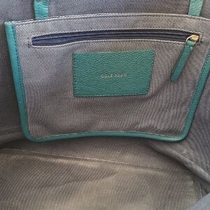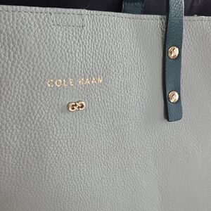 Cole Haan tote with teal combo colorway. Perfect for everyday use. Large compartment with an attached zip pocket and card slot. Snap closure