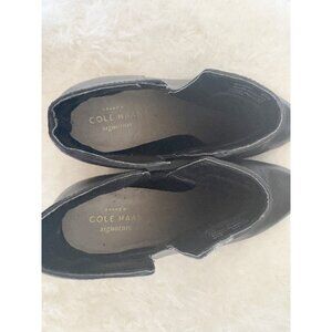 Amazing Cole Haan booties in fantastic condition--worn once--but has a minor imperfection at the top of the right bootie--please see pics. Super soft black leather with wood 1.75" heel and cream, visible stitching.