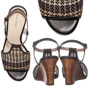 Cole Haan Maddie Open Toe Wedge Sandal US 9 Black Brown Woven Boho Chic Neutral