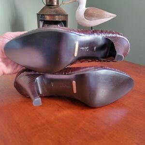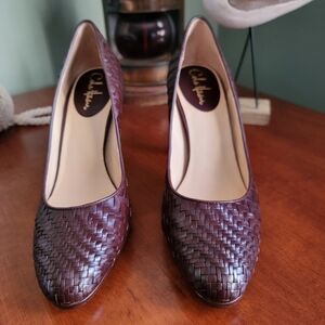 Cole Haan Mahogany Woven Leather 3.5" Wood Stacked Heels have Nike Air Insoles technology. The exterior of the shoe is woven mahogany brown leather, with a wood stacked 3.5" heel. Has a soft, rounded toe shape. The interior is super comfortable, with Nike Air insoles underneath the tan interior. Dark brown leather bottoms. Size 10B women's, average width. This is a beautiful shoe!
