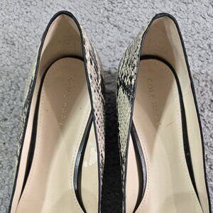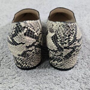 Good used condition. Embossed snake print loafers, with a contrast black panel. Pointed toe, low heel.