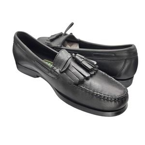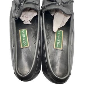 Pre-owned men's Cole Haan matte black leather kilted tassel loafers. Made in Mexico.