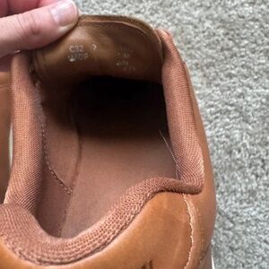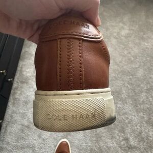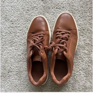 Leather sneakers by Cole Haan. Grand Court line, medium brown leather, laces, and white sole. Good used condition! Can dress up or down!