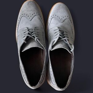 Step up your style with these Cole Haan Grand Wingtip Oxfords. Crafted from soft grey suede with classic brogue detailing, these lace-up shoes are perfect for work, events, or smart-casual outings.