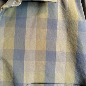 Features: button down shirt, colors as green/blue/grey, lightweight, long sleeve, stretch, materials are cotton/nylon/spandex, easy care- machine washable