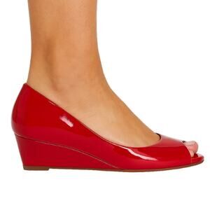 Keywords: Cole Haan red patent wedges, Morgan peep toe heel, EUC size 7.5, red leather wedge, classic red work shoe, low heel comfort wedge, everyday dressy shoe, Cole Haan wedge pumps