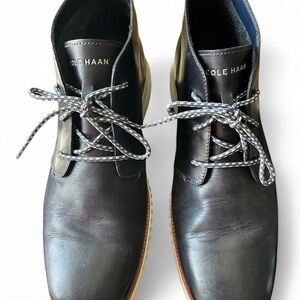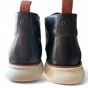 Sleek navy leather chukka boots. Features a contrasting white sole. Stylish and versatile for any outfit.
