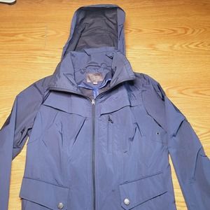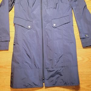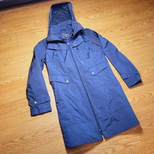 Navy utility jacket with a hood. Features front pockets and a sleek design. Ideal for everyday wear.