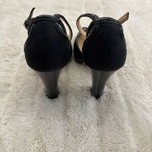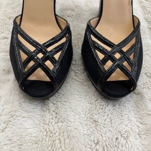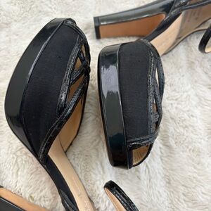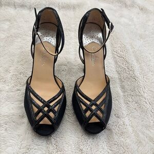 Cole Haan chic black platform heels with strappy design. Peep-toe style for a modern look. Ideal for any event.